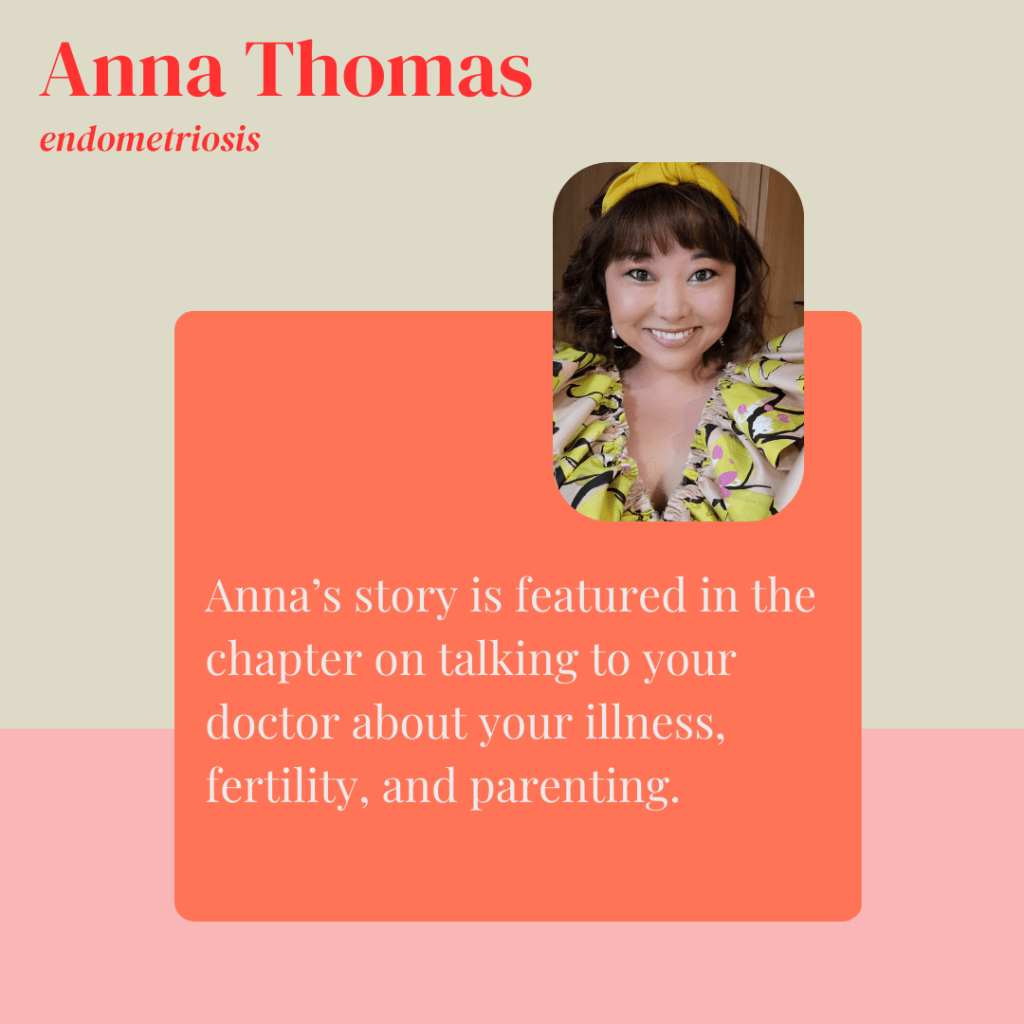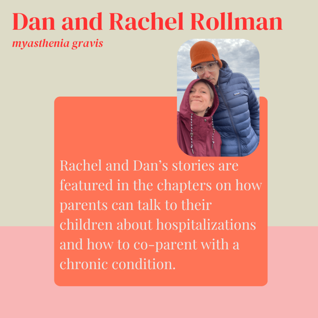 While writing and researching the book, I spent more than 100 hours interviewing parents from around the world with a wide range of conditions including recurrent cancer, myasthenia gravis, amyotrophic lateral sclerosis (ALS), Parkinson’s, cystic fibrosis, kidney disease, endometriosis, depression, lupus, type 1 diabetes, and more. I also interviewed a wide array of experts including child and family psychologists, genetic counselors, clinicians, and child life specialists.